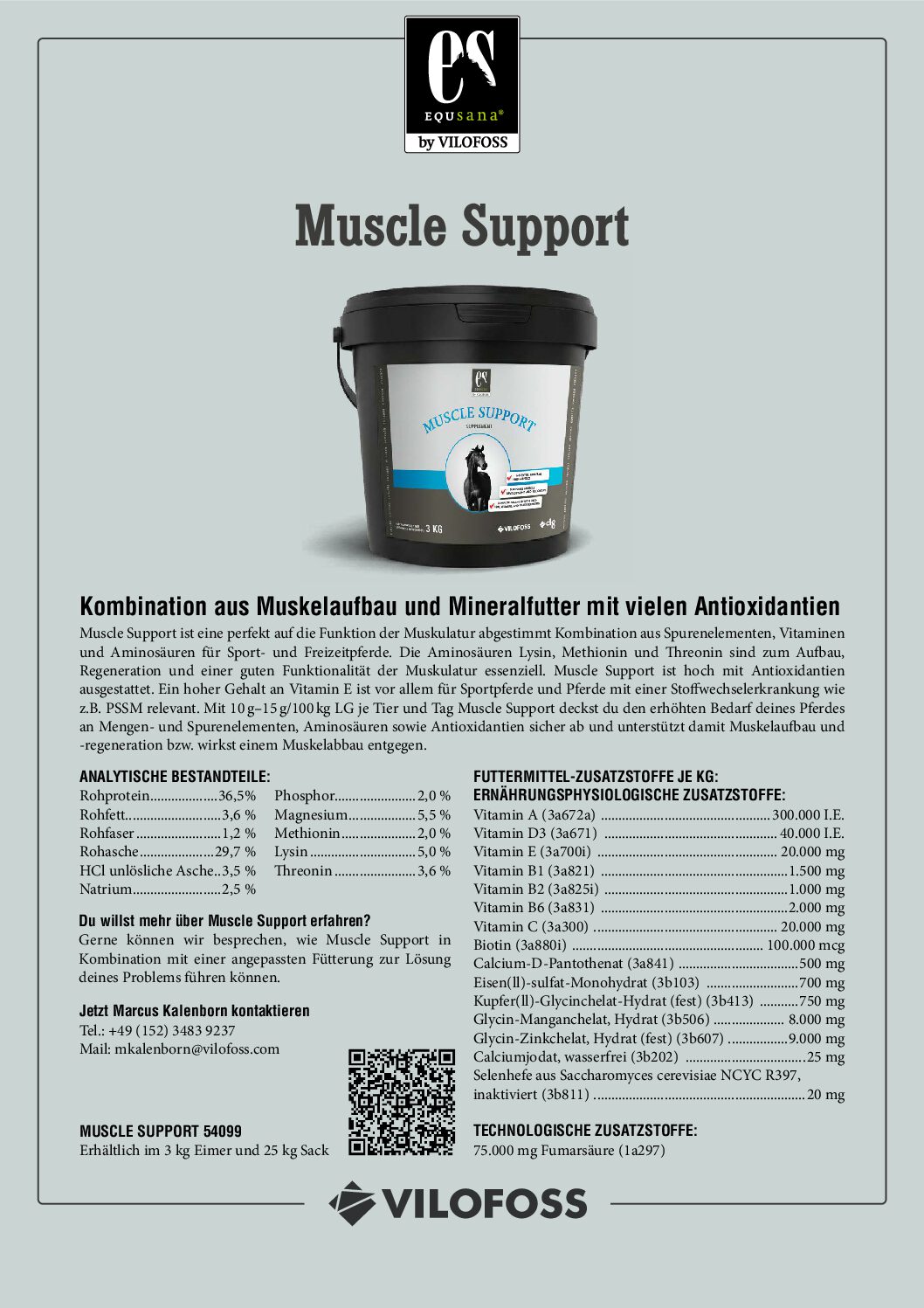 Muscle Support ist ein hochwertiges Ergänzungsfuttermittel für Pferde, das gezielt auf die Bedürfnisse der Muskulatur abgestimmt ist. Die Kombination aus essenziellen Aminosäuren, Vitaminen, Spurenelementen und Antioxidantien unterstützt effektiv den Muskelaufbau, die Regeneration und den Schutz der Muskelzellen – ideal für Sport- und Freizeitpferde.